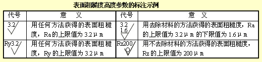 表面粗糙度高度参数Ra、Rz、Ry在代号中用数值标注时,除参数代号Ra可省略外,其余在参数值前需标注出相应的参数代号Rz或Ry,标注示例见表。