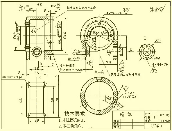 在标注尺寸方面,通常选用设计上要求的轴线、重要的安装面、接触面(或加工面)、箱体某些主要结构的对称面(宽度、长度)等作为尺寸基准。对于箱体上需要切削加工的部分,应尽可能按便于加工和检验的要求来标注尺寸。