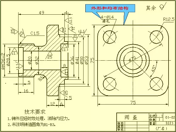这类零件的基本形状是扁平的盘状,一般有端盖、阀盖、齿轮等零件,它们的主要结构大体上有回转体,通常还带有各种形状的凸缘、均布的圆孔和肋等局部结构。在视图选择时,一般选择过对称面或回转轴线的剖视图作主视图,同时还需增加适当的其它视图(如左视图、右视图或俯视图)把零件的外形和均布结构表达出来。如图中所示就增加了一个左视图,以表达带圆角的方形凸缘和四个均布的通孔。