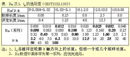 1)) 轮廓算术平均偏差(Ra)--在取样长度内,轮廓偏距绝对值的算术平均值。Ra的数值及取样长度l见表。