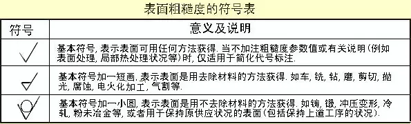 2)表面粗糙度的代号、符号及其标注 GB/T 131-1993规定了表面粗糙度代号及其注法。图样上表示零件表面粗糙度的符号见下表。
