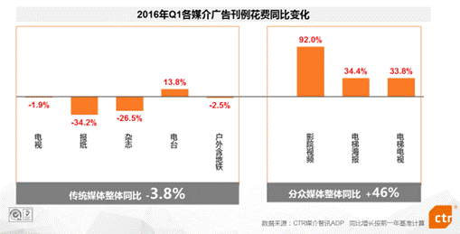 2016年一季度,传统媒体收入继续下降,降幅为-3.8%,保持增长的依旧是分众电梯电视33.8%、电梯海报34.4%和影院视频92%,互联网广告则保持28.4%的平均增幅。