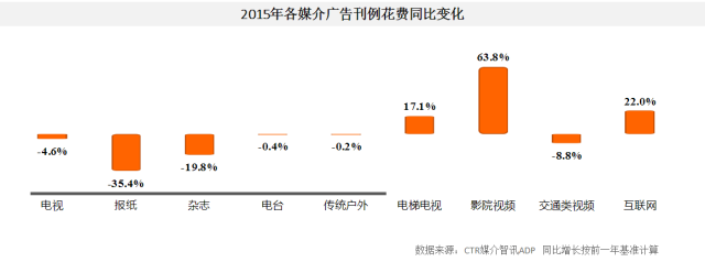 2015年中国广告市场整体降幅是-2.9%,这是监测15年来首次年度降幅的一年。各媒体表现看,传统五大媒体广告花费全线下滑,影院视频广告(涨63.8%),互联网广告(涨22%),分众电梯电视(涨17.1%)是唯一呈现上涨的三大版块。