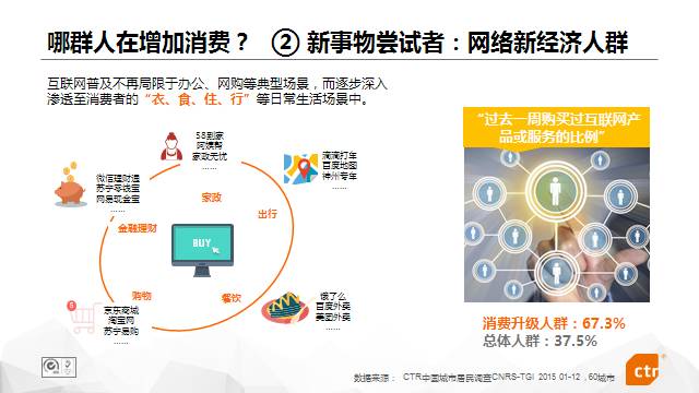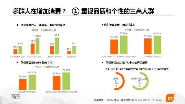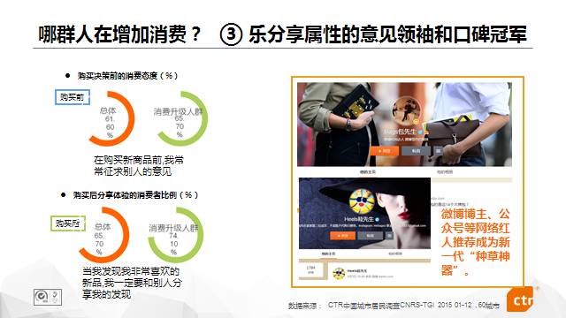 速前行的中国市场中,消费升级和追求品质逐步成为刚需,唯有优质的品牌方可获得消费者的溢价购买; 重视商品品质和个性的高端人群、勇于尝试新事物的网络新经济人群、乐于分享属性的意见领袖和口碑冠军是积极推动消费市场发展的三类人群,不仅代表了消费的潮流,也是未来消费倾向和趋势的引领者,这三类人群构成了中国新消费市场的风向标人群。