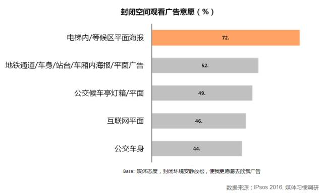 移动互联网的发展使人随时随地可以获取信息,一方面使资讯方式和媒体消费时长日益转向移动端,但用户在移动端是有选择的,主要收看的是资讯内容,对广告往往选择性忽略,对品牌很难形成有效记忆,而另一方面由资讯过度,信息爆炸,选择太多令消费者注意力涣散,广告越来越被稀释,这使得分众旗下的电梯电视,电梯海报广告,影院视频等处在用户必经的封闭的生活空间中的媒体以其强制性和不可选择性在移动互联时代受到了更多广告主的认同。比如电梯媒体因为相对封闭的空间,消费者接受信息特征,其强制性、无干扰、高频的特性,能够使受众的注意力更加集中。这样的承载环境,促使传播能高效到达。