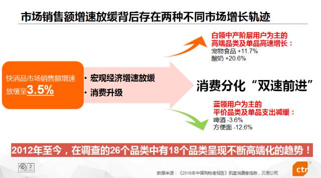 2015年,中国快消品市场销售额增速放缓至3.5%。中国快消品市场存在两种不同的快慢车道——即,平价品类出现缓慢的降幅,高端品类持续成长。管理咨询公司贝恩公司(Bain & Company)与凯度消费者指数(Kantar Worldpanel)在其持续第五年的《中国购物者报告》中指出了这种分化,并将之总结为“双速前行”。