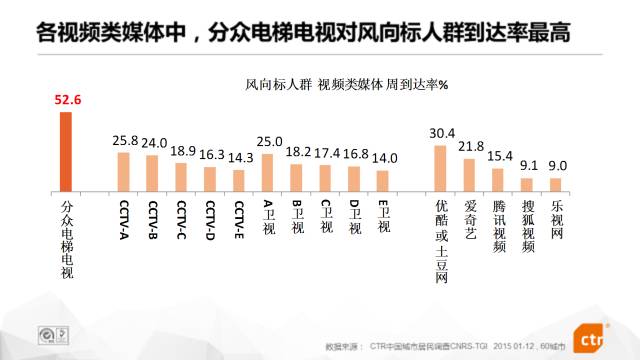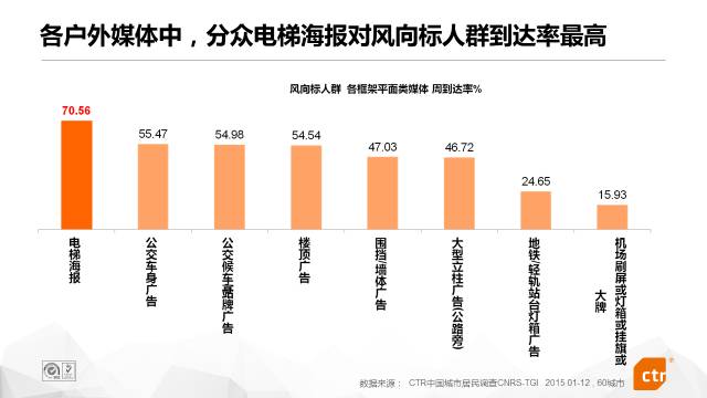 分众电梯媒体覆盖120个城市,110万块电梯海报,18万块电梯电视,每天覆盖的这2亿消费者是20-45岁,中高收入的城市主流消费群,这些白领,金领,商务人群,中产阶级是引领消费升级的核心人群。所以在到达这些具有风向标价值的主流消费人群方面占有非常突出的优势。在视频类媒体中,对风向标人群,分众电梯电视的周到达率是52.6%,高于各大电视台和各大视频网站。而电梯海报周到达率70.56%,也高于其他平面类户外媒体。