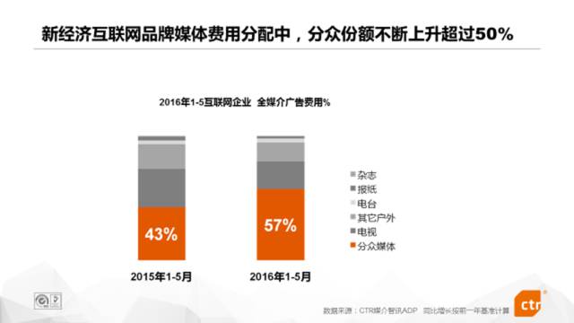 尤为是对于新经济互联网品牌的广告投放中,在2016年1一5月以分众电梯媒体和影院视频呈现出135%的高增长势。从数据看,新经济品牌在整个媒体的预算上面,分众占据的份额从2015统计的43%上涨到2016同期的57%。