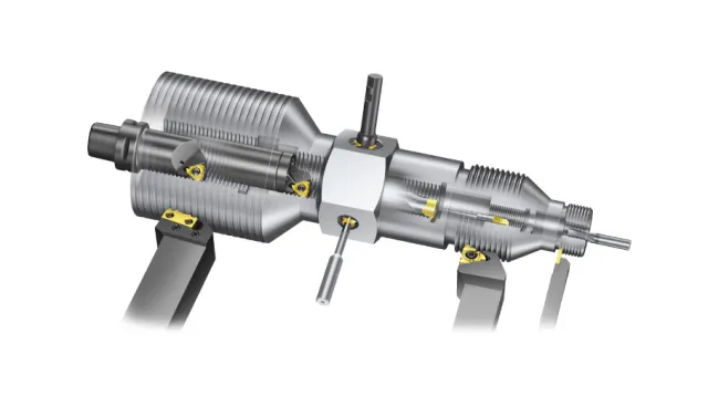如图4所示,刀具在开始切削前,先将扳手7柄部扳转,通过杠杆作用,同时利用装配扳手7和小刀排1上的拉簧销2,带动小刀排1向下移动,此时小刀排1上一侧的定位孔也向下移动,当小刀排1上定位孔与定位柱9前端头部位置对照时,由于弹簧10的弹力作用,使定位柱9头部插入到小刀排1定位孔中,于是小刀排1被限制退回,刀具14位置被固定,刀具处于切削位置,当刀具在工件中切削达到预定深度时,则装在定位臂11上的退刀限位调节螺钉12与工件外侧端面相接触,由于此时机床处于进给状态,在进给力的作用下,使定位柱9作相对后移运动,并压缩弹簧10,直至定位柱9头部脱离小刀排1上的定位孔,在拉簧6的作用下,小刀排1迅速退回原始位置状态,即带动刀具14在刀槽中移动完成自动退刀动作,从而实现一次切削运动。由此循环往复,直至螺纹切削加工完毕。