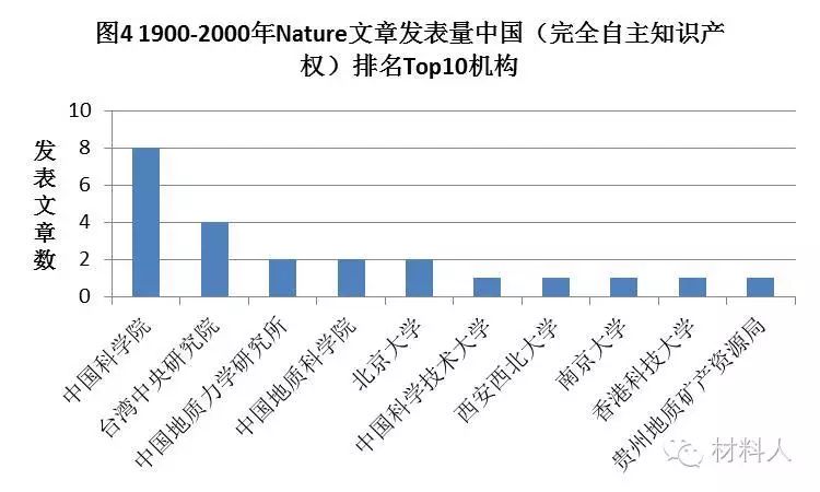 之前提到,整个中国1900-2000年发表在Nature上的文章一共是116篇,小编对这116篇文章按机构进行排名,结果如图3所示。可以看出,排名前三位的分别是中国科学院、台湾中央研究院和中国地质科学院,而还有一些国外的研究机构也列在其中,这是因为通常发表在Nature这种级别期刊的研究成果都是通过好几家单位来共同完成的,这116篇文章指的是作者单位中包含中国研究机构的数目。
