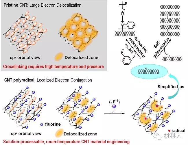 在电荷转移引起的氟化碳管脱氟过程中,具有反应活性的单壁碳管自由基首次被观测到。因为高度氟化对离域共价电子体系的彻底破坏,脱氟碳管上产生的自由基在多位点被定域,从而使碳管成为可以主动引发其他有机单体或碳管自身聚合的一维聚自由基载体。因为单壁碳管较高的表面张力降低了电荷转移的能垒,碳管自由基的产生可以在室温下得以实现。碳管自身聚合(即管壁交联)的条件因此从过去需要复杂条件骤降到常温常压在溶液中进行。