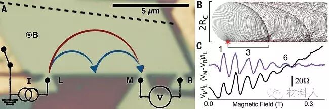 近日,来自美国斯坦福大学的David Goldhaber-Gordon(通讯作者)等通过测量同一磁场中相邻触体间的轨道运输,被称作横向电子聚焦效应,来研究moiré微能带中电子的动力学特征。在低温下,研究人员观察到跃迁轨道的焦散线在数以百计的超晶格周期方向延展,为连续微能带逆转了回旋加速器的回旋,终止了在范霍夫奇点附近的回旋运动。在高温下,电子与电子间的碰撞抑制了聚焦。研究这类微能带的传导性能在设计超晶格器件中新型的运输行为很有必要。