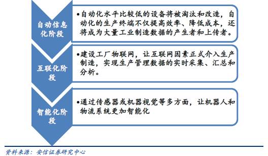 根据我们对行业的实际访谈,得知:智能制造发展不是一蹴而就的,而是“自动信息化”、“互联化”到“智能化”层层递进、演变发展的。产业链涵盖智能装备、工业互联网、工业软件及将上述环节有机结合的自动化系统集成及生产线集成等。