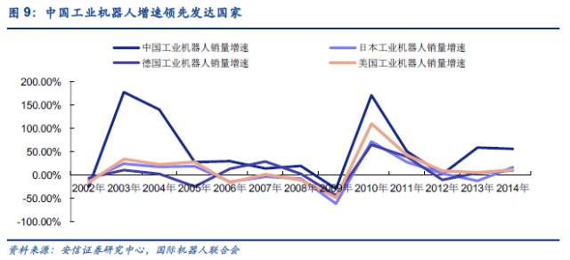 中国机器人产业联盟数据显示,2014年全球机器人销量增长27%至22.5万台,中国市场销量增长54%至5.6万台,连续两年成为全球最大工业机器人市场。其中国内企业销售16945台,比上年增长77%,外资企业在华销售约40000台,较上年增长47%。在过去十年,中国机器人市场销量年均复合增长率达到32%,2013、2014年分别达到45%、54%。
