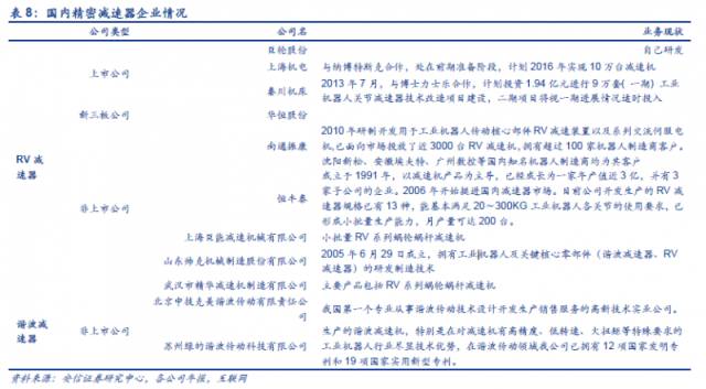 国内涉足RV精密减速器的公司有上市公司秦川机床、上海机电、巨轮股份,新三板公司有唯一标的恒华股份,非上市公司有南通振康、恒丰泰、武汉精华、上海精华、山东帅克等,涉足谐波减速器的有非上市公司苏州绿的谐波传动科技有限公司、北京中技美克谐波传动有限公司等。