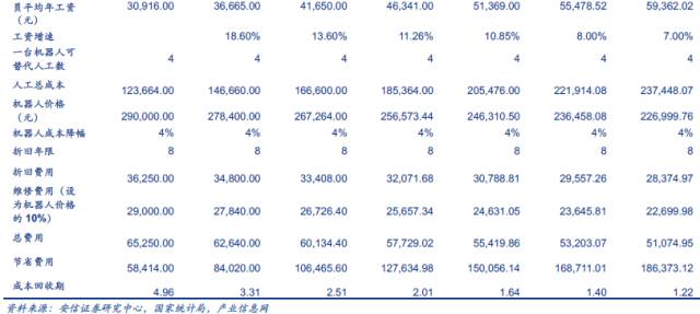 从机器人的成本回收期看,会。根据国家统计局的数据,我国制造业城镇单位就业人员的年平均工资从2010年都 30916万元增长到2014年的51369万元,年均增速达到13%。根据中国产业信息网的资料,工业机器人的成本逐年递减4%。以165KG 的六轴机器人为例,其回收周期将由2010年4.96年下降到2016年1.22年。随着人力成本的上升、老龄化的加剧,我国数量庞大、低成本劳动力优势在逐渐丧失,基础性工作招人越来越难。工业机器人成本的下降,机器人的投资回收期还将进一步缩短,将有助于机器人逐步实现劳动力替代。