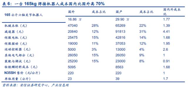 国产机器人比进口机器人贵,原因在零部件上。根据产业信息网发布的《2014-2019年中国钕铁硼永磁材料产业市场分析及投资前景预测报告》,目前一台165kg焊接机器人成本国内约为29.9万元,而国外大约为16.86万元。零部件成本差异是造成国内外机器人成本差距的最大因素,其中减速器是成本差异最大部分,国内和国外和成本比达到4.4,控制器的国内外成本比,达2.6,伺服电机(驱动)的国内外成本比为1.68(1.95)。国内的材料消耗也更大,如在永磁同步伺服电机中钕铁硼材料成本,国内单体用量比国外高接近1倍。