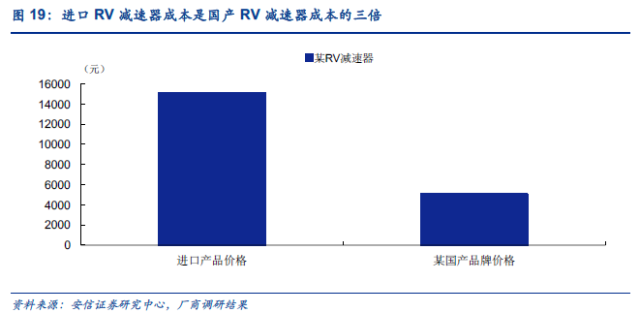 工业机器人零部件亟需国产化突破,并且是规模化量产的突破,否则没有意义。减速器是国内机器人产业必须攻克的关卡,尽管研发过程漫长充满挑战,也有少数公司经过多年研发,生产出了减速器,但未大规模量产。日本减速器掌握减速器市场的绝大份额,大规模量产,生产成本低,掌握了定价权。根据我们的草根调研,国外进口RV减速器价格是国内企业减速器产品的3倍,他们还有很大的降价空间挤压中国品牌。国内即使研发出合格的减速器,也得量产才有意义。否则没有量,就算技术达到日本标准,日本四大家机器人公司同样不会买中国的。