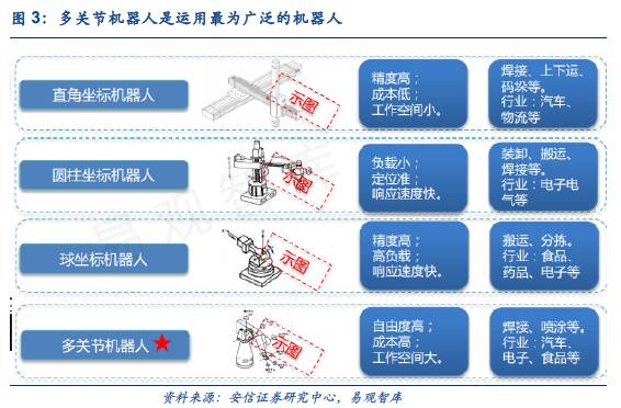 工业机器人目前从市场化和可接受的角度是大大高于服务类机器人的,这可能也和现实的市场需求有较大关联,很多产品的普及从历史角度来看,也是先工业后民用。工业机器人从机械结构可分为: