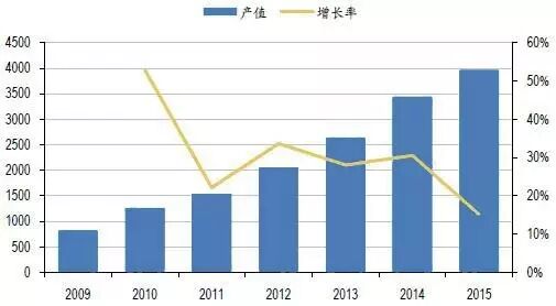 2009-2015中国LED产值及其增速