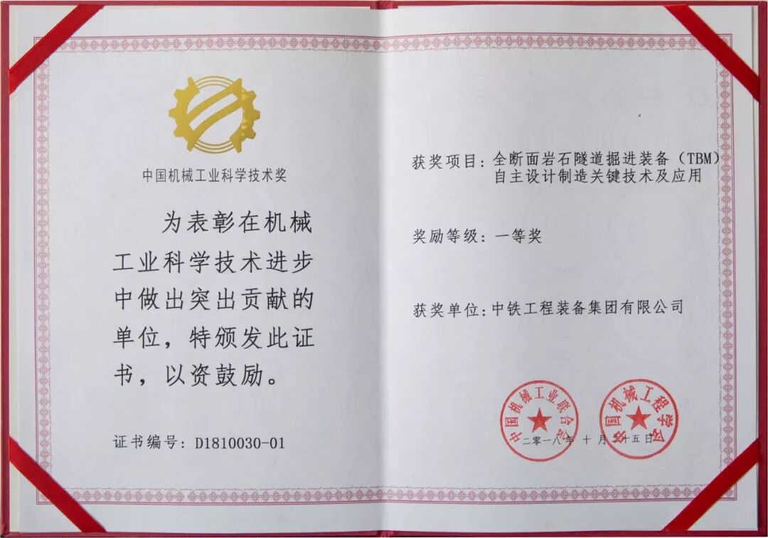 近日,2018年度中国机械工业科学技术奖评审工作顺利结束,经来自中国工程院、中国科学院、机械行业领域的30余位院士、专家的严格评审,由中铁工程装备集团牵头并联合浙江大学、大连理工大学、山东大学、中铁隧道局集团共同申报的“全断面岩石隧道掘进装备(TBM)自主设计制造关键技术及应用”项目顺利通过终审答辩,并获得众位院士专家的高度认可,最终摘得2018年度“中国机械工业科学技术奖”一等奖。